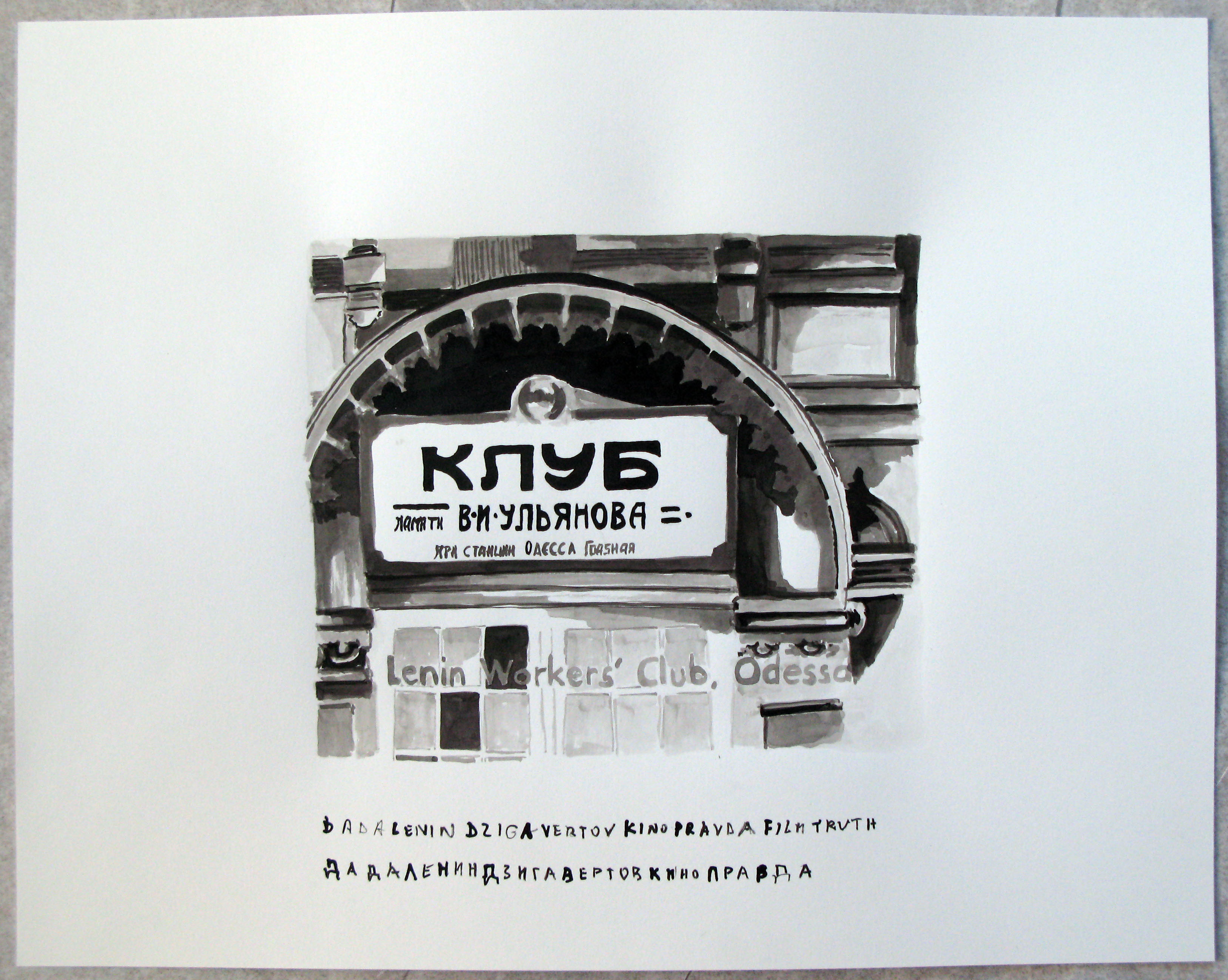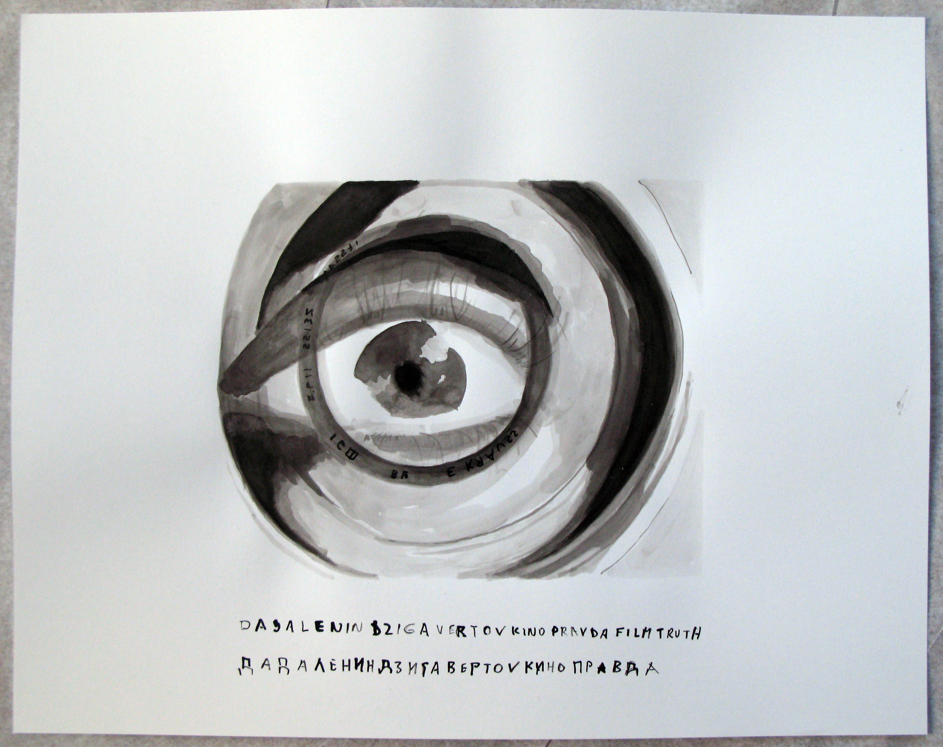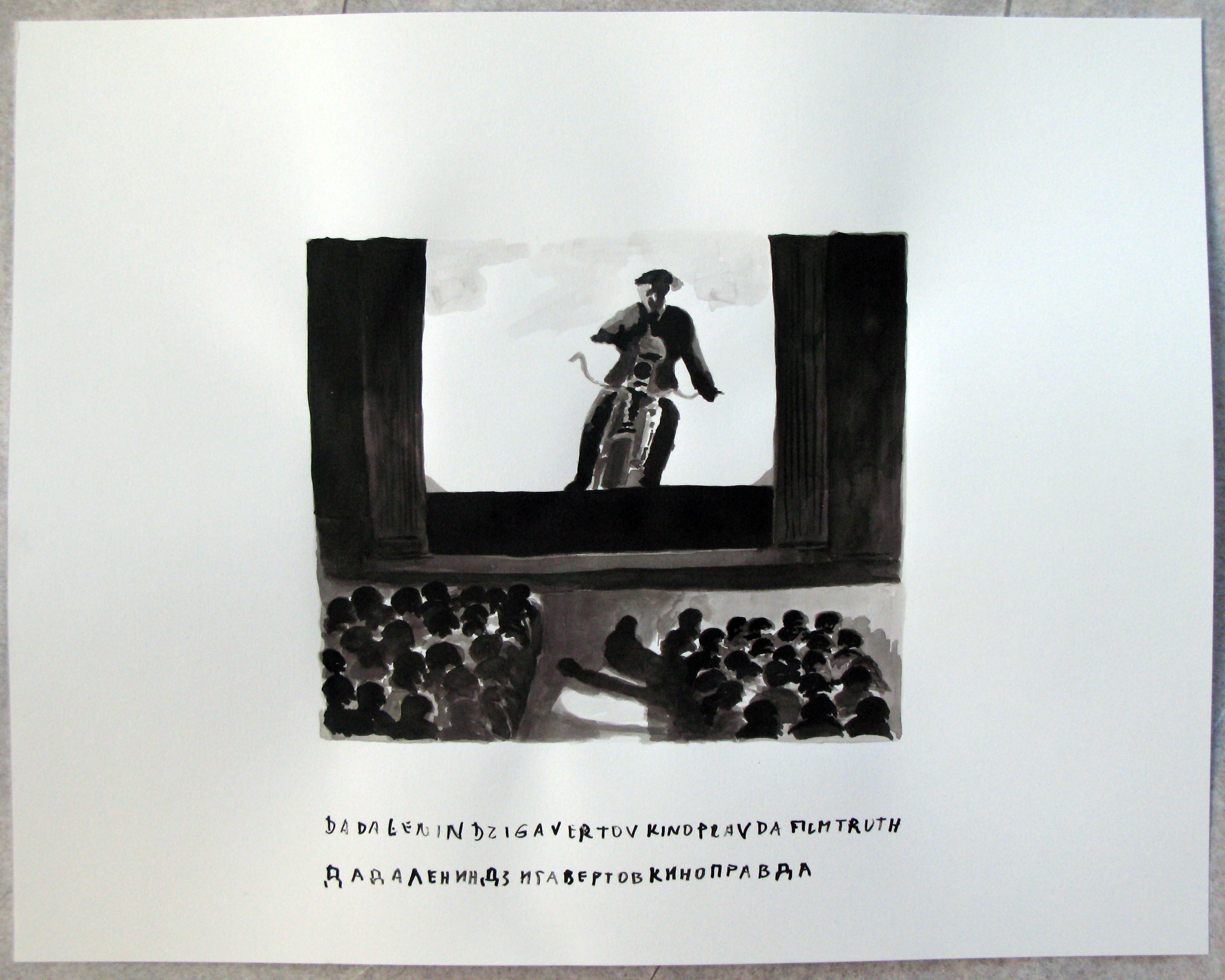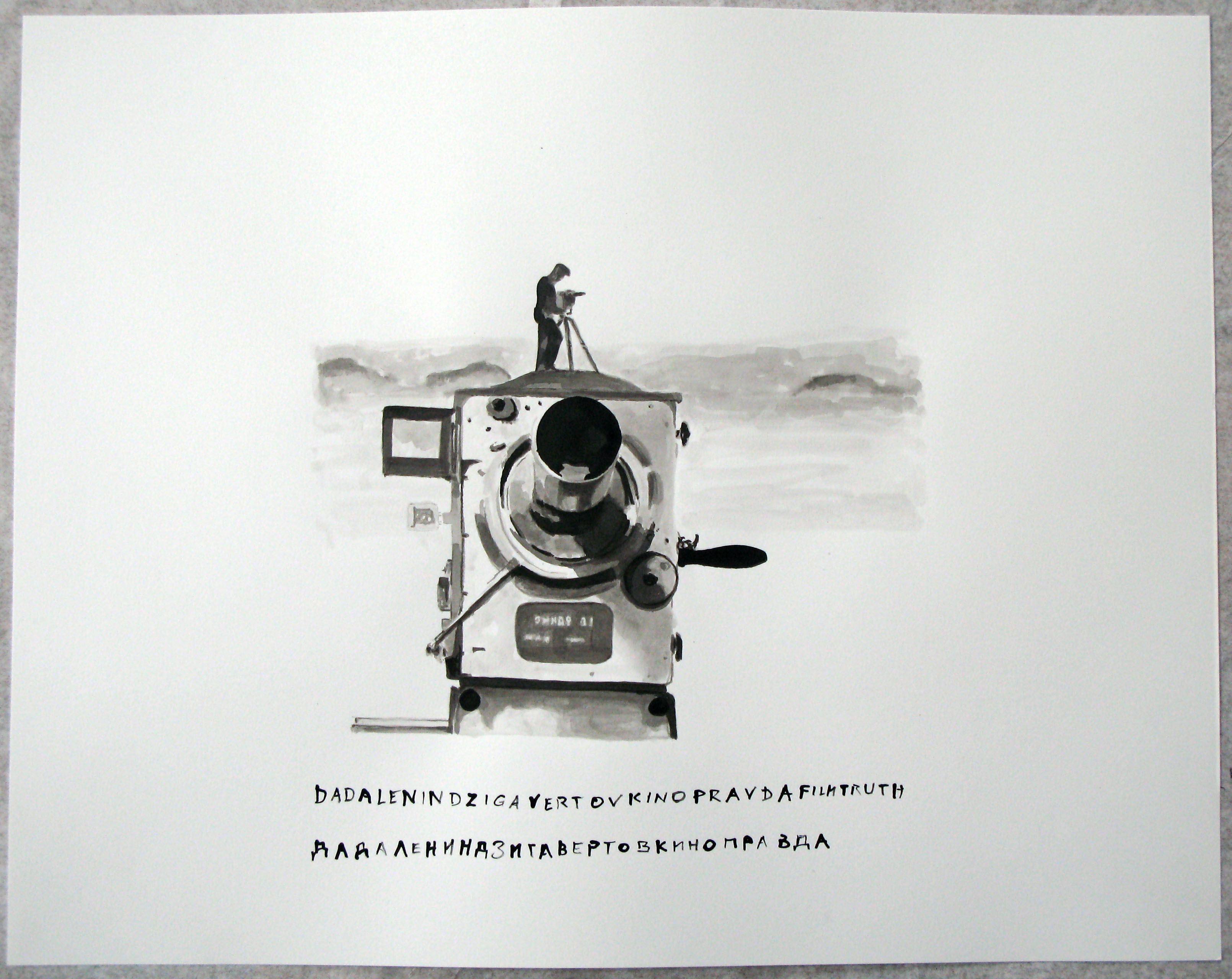 Dziga Vertov's Man with a Camera tries to give an "unedited" view on Soviet life - in 1929; He tried to create a cinematic experiment to "create a truly internationall absolute language, a cinema based on the total separation from the language of theater and literature, ... without sets, actors, etc. " I have selected 42 film stills and had them rendered in ink with the help of my assistant. Vertov's experiment to "create an international abosolute language". the ink drawings highlight the wonderful believe in the revolution of a new artistic medium (hence: my anachronisitc format) i.e. film who was of cousre, immediately instrumentalized in propaganda and worse. Dada is interpreted by me not only as a critic of utopian dreams but also as a non-explicit critic of technology. the film's embrace of mechanical representation and its drive to overcome theater, literature and other forms of art - transcending actors, film sets and screenplays - interests me since it is embedded in the teleological hopes for a Lenininst soveit society that is equal, just and hence 'representational". The technics of superimposing and flicker montage as well as the cameramen's sensibility to caputre the poetry of his nearly encyclopedic approach to filming the soviet industry, soviet work and it's daily live (including war, accidents and death) allow to create moments that are dadaist in appearance and spirit. Needless to say, that Lenin (as well as his Fife Year plan) also has his appearance. needless to say, the film is really also about production and specifically the production of this film. filming is presented as part of the national production of a soviet empire, the (dada)lenin revolution. the cutting of the film --- editing is given a major importance.. as well as srcreening.. : the public is also alwasy included. the major protagoist is the camera man. or lets say, the man with the camera, walking, standing, driving, flying, doing magic with his camera.. filmed by another camera which is not in the screen.. (there is no mirror situation with 2 camera in the screen but sometimes the objective of one camrea mirrors the filming second camera --- yet another observation : the omnipresence of the film camera is an anticipation of the control totalitarian society turned into.. - and neo-liberal societies are now becoming : even without cameras --- we are seeing now without cameras... (electronically - by what people key into computers == ps: we see typwriters in Vertov).last but not least, even the viewer in Vertov's film, the spectator in the movie is subject to filming and gets scrutinized non stop... just like today's advertizing agencies are having their ratings measured. these drawings give us back the breath that is taken while seeing these news real kind of strips... and one can see that it is a very carefully, aestheticized and thoughfully edited film that not only had a script but also an ideological basis that carries these images into eternity trying to render film making into the most sublime of all productions topping even the people in machine rooms and miners underground. Vertov was himself a victim of the Soviet System he helped to create inasfar as he couldn't really tell the "truth", was in fact pushed out from his job and couldn't do anymore his real shows.... Even the Soviet Union prefered "hollywood style" genres to his topological filming. Thus he is himself DADALENIN and can be happy to have survived it. (which might not have been the case, had he had more success -- as in the case of Stalin's Social Engineering who where all liquidated and executed. paper size: 19 x 24 inches (48 x 61 cm ), inch on paper more of these drawings here: